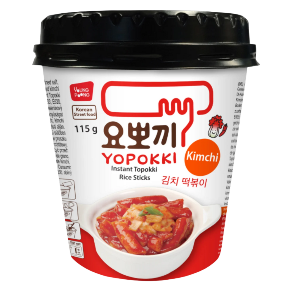 Kimči ir tteokbokki (taip pat rašoma ddukbokki) yra pagrindiniai korėjiečių virtuvės patiekalai, garsėjantys savo skoniu ir ryškiu raudonu atspalviu. Šis greito paruošimo aštrus ryžių virtinukų puodelis suteikia autentišką tteokbokki skonį, nes jame yra švelnūs garaetteok - kramtomi cilindro formos ryžių pyragėliai, aplieti saldžiu ir aštriu pomidorų aitriųjų paprikų padažu su kimči prieskoniu. Šis patogus patiekalas paruošiamas vos per kelias minutes ir puikiai tinka troškimui patenkinti. Jei norite tradicinio patiekalo, jį papildykite kietai virtu kiaušiniu arba šviežiomis jūros gėrybėmis.