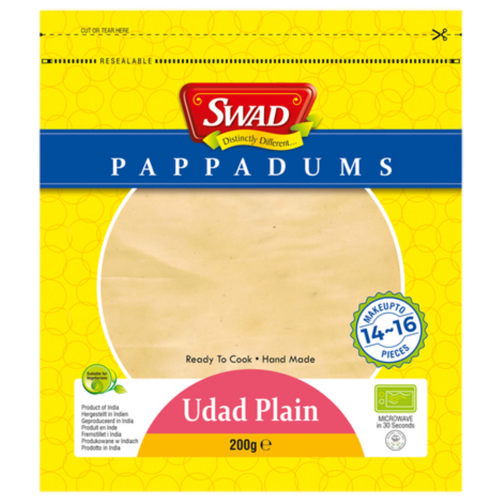 Indiški papadamai (papad) iš patikimo SWAD prekės ženklo, pagaminti iš aukščiausios kokybės urad dal miltų ir prieskonių, todėl juos kepant ar šildant mikrobangų krosnelėje, jie tampa lengvi, traškūs ir įgauna subtilų pikantišką skonį. Šie klasikiniai papadumai gražiai išsipučia, virsdami plonais, traškiais diskėliais, kurie puikiai tinka prie bet kurio indiško patiekalo. Idealiai tinka patiekti su kariais, dal, ryžiais, marinuotais agurkais, čatniais arba kaip atskiras traškus užkandis.