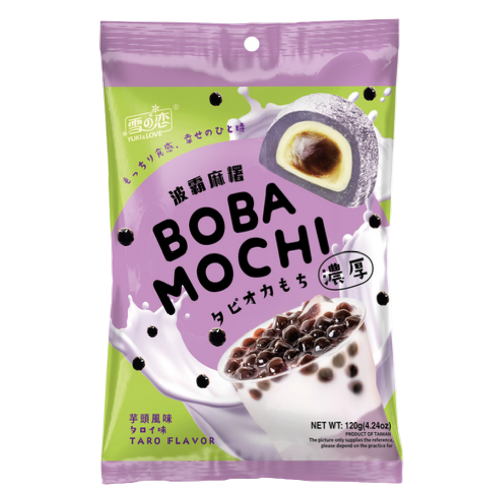 YUKI & LOVE Taro skonio „Boba Mochi“ - minkšti, tąsūs, lipnūs ryžių pyragaičiai, pripildyti švelniai saldžios, žemės skonio taro pastos ir žavių boba perlų, kurie kiekviename kąsnyje sukuria nepakartojamą daugiasluoksnį potyrį. Šioje 120 g pakuotėje yra maždaug 8 atskirai supakuoti mochi gabalėliai, pagaminti iš tikrų taro miltelių ir autentiškų lipnių ryžių miltų, kurie suteikia autentišką tradicinio japoniško mochi skonį su madingu boba arbatos prieskoniu. Taivane gaminami mylimo prekės ženklo, kuris užkandžiams suteikia „laimę ir meilę“, šie skanėstai sujungia tamprią, aukščiausios kokybės mochi tekstūrą su kramtomaisiais boba perlais ir išskirtinėmis riešutų ir vanilės natomis, būdingomis violetiniams taro. Puikiai tinka boba arbatos entuziastams, ieškantiems nešiojamų burbulinės arbatos skonių, mochi mėgėjams, norintiems naujoviškų azijietiškų desertų, arba visiems, trokštantiems Instagramo verto skanėsto, kuris sujungia du mylimiausius Azijos skonius vienoje nuostabioje pakuotėje.